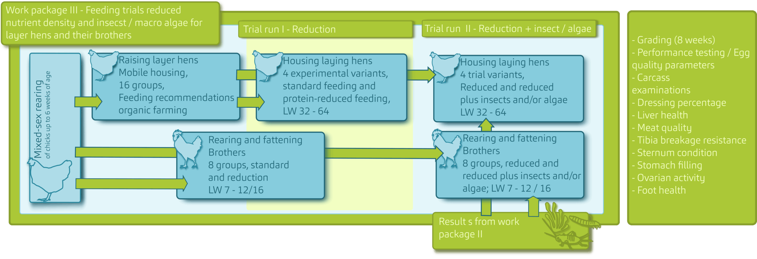 In a second experimental setup, the effects of feeding alternative protein sources during the rearing of laying hens are being tested using a ration from AP 2. For this purpose, six groups of 20 hens are being reared under organic conditions and a laying period is being tested. Three groups receive standard rearing rations (from cooperation partner Thünen Institute), while three groups are reared on alternative rearing feed containing algae or crickets. This is to rule out any negative effects of feeding on the development of the laying hens. During rearing, the test program from the TiHo selection trial is carried out analogously. During the laying period, the laying performance of each group is recorded daily, egg size distribution and feed consumption weekly, animal health is assessed every 8 weeks using MTool animal assessments, and, as far as possible, the laying performance of individual animals is recorded 6 times during the laying period on 5 consecutive days using drop nests.